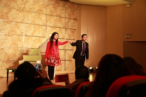 晚会由体育学院学生表演的中华传统武术拉开序幕。狮舞、旗舞,以及拳术、刀术的表演,令人目不暇接,让人感受到中国功夫的韵味。随后是九江京剧票友、必赢艺术学院民乐队表演的京胡协奏曲《夜深沉》,是从昆曲《孽海记·思凡》中的《风吹荷叶煞》的四句唱腔发展而来的一首脍炙人口的京剧曲牌。其由京胡独奏,击鼓相伴。这种独特的表演形式,富有中国民族气派,使乐曲更添光彩。而德籍华裔青年钢琴演奏家、钢琴教育家、德国柏林汉斯·埃斯勒音乐学院的钢琴老师韩卉菁女士独奏了中国钢琴作品《浏阳河》。此钢琴曲是上个世纪七十年代由民歌改编而来,其旋律十分优美,使听众不自觉地有一种怀旧的情绪。青年歌剧演唱家、博士、56.nt必赢官网柔性引进的德国音乐家团队的负责人熊柯嘉先生演唱了意大利民歌《请别忘记我》,深情、悠扬,完成一个漂亮的开场时,他牵着为其伴奏的韩卉菁女士的手,优雅地迎着观众的掌声致谢,韩卉菁女士还为熊柯嘉先生伴奏了他演唱的《红楼梦》插曲《红豆词》。