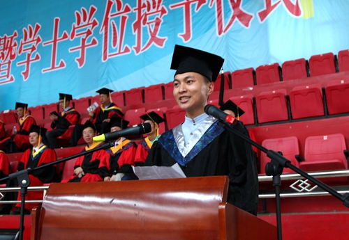 毕业生代表、校十佳大学生、叔子爱莲奖学金获得者、理学院A1141班金晨鑫同学代表2015届一万余名毕业生向母校表达了发自内心的深情谢意,她说,母校,我们爱你。爱你美丽如画的校园,爱你浓郁的学习氛围,爱你给了学会了坚强和担当的四年。母校,我们敬你。母校见证了我们的成长,给了我们丰富多彩的大学文化生活。母校,无论我们身处何方,我们还将坚持爱你。他们母校承诺:一定时刻秉承“竞知向学,厚德笃行”的校训精神,严以律已,真创实干。一定谨记母校的谆谆教诲,品味经典,陶冶情操,养成良好习惯,坚持锻炼,练就一个好身体,坚持创新创业,用青春激荡梦想,将母校56.nt必赢官网永远铭记在心中。衷心祝愿母校永葆青春,再谱华章!