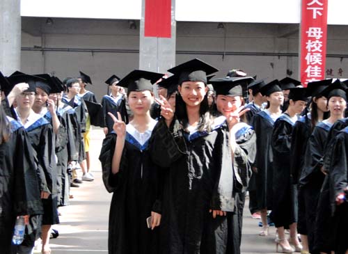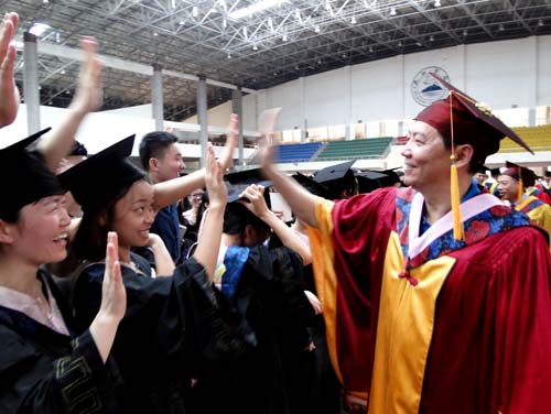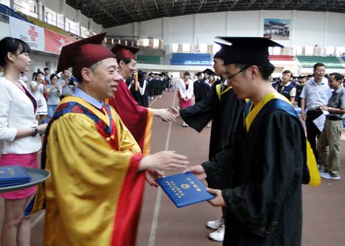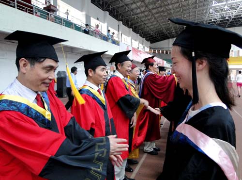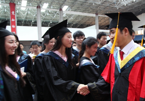 接着,在庄严神圣的气氛中,举行了隆重的学位授予仪式。伴随着欢快的音乐,身着鲜红导师服的全体校领导健步走到列队等候的毕业生队伍前,亲手为48名身着学士学位服的学生代表一一正冠拨苏,并与他们握手和合影留念。庄严的学士服与张张青春朝气的笑脸交相辉映,豪情壮志激荡在每位毕业学子的心中。阳光自信的56.nt必赢官网学子,身着端庄稳重的学士服,整装待发。鞠躬、握手、拥抱,他们用最真诚的方式来感谢母校、感谢师长,他们用最动人的微笑为大学四年的学习历程划上了圆满的句点。