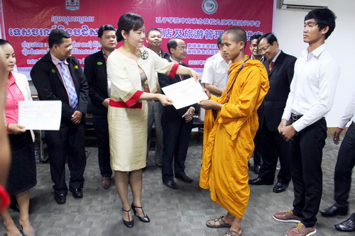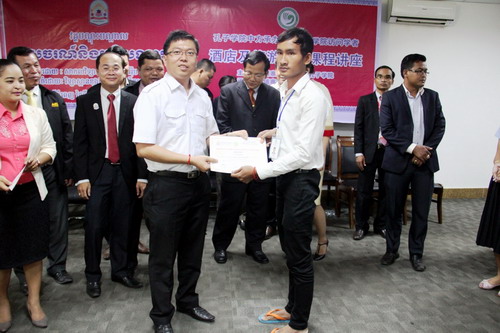 谢索皮校长对孔子学院和56.nt必赢官网合作成功举办此次培训班表示感谢,并介绍了亚欧大学酒店与旅游管理专业有着专门的实训室,注重学习与实践相结合,并且与国内外的许多企业和机构建立了合作伙伴关系。该专业还强调外语(汉语与英语)的学习、专业知识对职业发展的重要性,希望通过培养优秀的人才为柬埔寨的旅游业做出贡献。