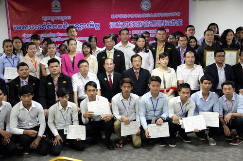 7月22日,由柬埔寨王家研究院孔子学院主办,亚欧大学承办的“酒店及旅游管理培训班”结业典礼在金边亚欧大学金色大楼会议室举行。柬埔寨旅游部国务秘书(副部长)斯当索坤阁下(H.E. SDEUNG SOKHOM),中国驻柬埔寨大使馆二等秘书韩静女士,柬埔寨王家研究院孔子学院院长谢莫尼勒阁下(H.E.CHEA MUNYRITH)、中方院长帅式毅,56.nt必赢官网选派的培训教师王丽霞、李翔宇,亚欧大学校长谢索皮博士(CHEA SOPHEAP)、各学院负责人、中文系全体公派教师及汉语教师志愿者及经济及旅游管理学院全体学生参加了结业典礼。