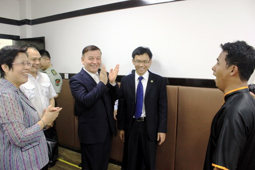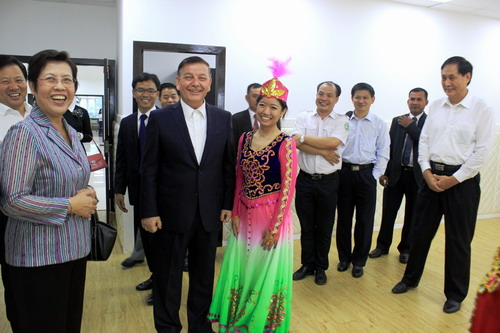 在布建国大使的陪同介绍下,艾力更·依明巴海副委员长参观了图书阅览室和电子图书阅览室,仔细询问了正在看书的孔子学院学生的学习情况,而由孔子学院教师承教的中华国际学校的小学生们的整齐稚嫩的“您好”声更是吸引了嘉宾们,艾力更·依明巴海向小孩子们亲切问好。极富中国文化特色的舞蹈室、武术室、书画室更是掀起了本次活动的高潮,多才多艺的孔子学院汉语教师志愿者们和柬埔寨学生们所展示的中国文化元素,赢得了嘉宾们的交口称赞。