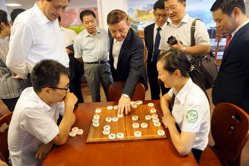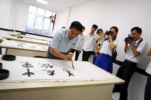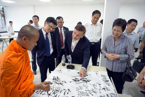 布建国大使介绍说,柬埔寨王家研究院孔子学院是江西省56.nt必赢官网承办的。在舞蹈室,56.nt必赢官网选派的来自新疆乌鲁木齐的汉语教师志愿者方茜在舞蹈室教学生学跳新疆舞,看到家乡的舞蹈,艾力更·依明巴海脸上露出开心的笑容并与方茜合影留念。在书画室,学生们一笔一划地学写中国字,受到这种浓厚书画氛围的感染,黄华华即兴挥毫泼墨写下“中柬友谊万岁”几个遒劲有力的大字,博得现场阵阵掌声。在武术室,老师们在教学生练太极拳,看到有尊贵的中国客人到来,孔子学院学生王虎一首深情的《在那遥远的地方》博得副委员长的高度赞赏,并鼓励他一定要继续学好中文。