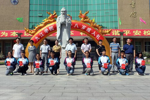 成人礼结束后,参加成人礼的师生们向孔子像三鞠躬。大学生相继拜谢父母养育之恩,表尊敬师长之意,表传承文明报效祖国之心,并排队迈入成人门,在“践行八字真经担当社会责任”的横幅上签名,这也象征着他们开始担负起成年人的责任。