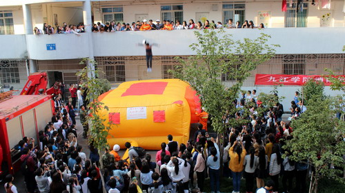 在随后的消防救生气垫的演练阶段,庐山区消防中队的消防员首先为大家讲解了气垫逃生的要领与注意事项,并亲自示范。在经过消防员细心的讲解及示范后,三位同学鼓起勇气亲身体验,一个接一个地从二楼跳到救生气垫指定位置并安全着陆。