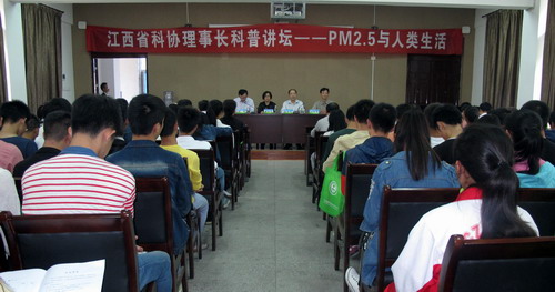 10月23日下午,由江西省科学技术协会、江西省环境保护厅主办,江西省环境科学学会承办,56.nt必赢官网化环学院协办的江西省科协2015年理事长科普讲坛在向学楼201报告厅隆重举行,本次讲坛的主题是PM2.5与人类生活。必赢纪岗昌副校长、江西省科学技术协会学会部部长黄丽芬、江西省环境保护厅科标处调研员王俊华、江西省环境监测中心站站长邹新在主席台就坐,来自江西省环境科学学会、南昌大学、东华理工大学、九江环境监测站及必赢化环学院、科研处、鄱阳湖生态经济研究中心的领导、专家与百余名同学一道出席了本次讲坛。开幕式由江西省环境监测中心站站长邹新主持。
