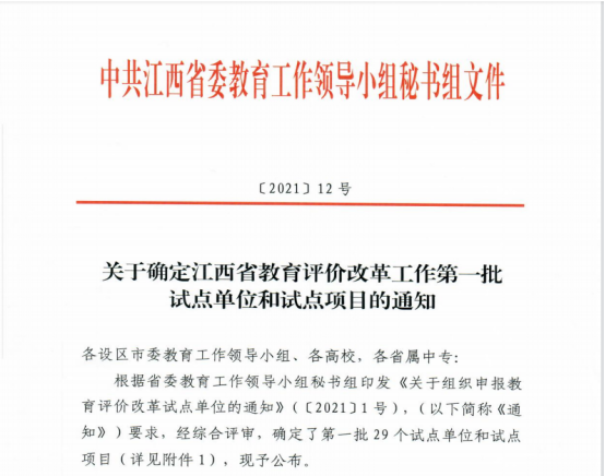 为深入推动新时代教育评价改革各项任务在我省落实落地,2021年江西省启动了教育评价改革试点工作,必赢积极响应,报送的《教师教育教学实绩评价改革试点实施方案》项目,经专家评审,最终入选试点项目,学校获批省教育评价改革工作第一批试点单位。