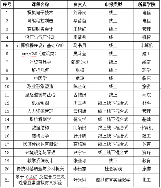 根据《关于公布2021年江西省线上、线下、线上线下混合式、社会实践一流本科课程认定结果的通知》(赣教高字〔2022〕3号)和《关于公布2021年江西省虚拟仿真实验教学一流本科课程认定结果的通知》(赣教高字〔2022〕5号),2021年,必赢共有21门课程通过江西省一流本科课程认定,其中线上课程11门、线上线下混合式课程7门、线下课程1门、社会实践课程1门、虚拟仿真课程1门。