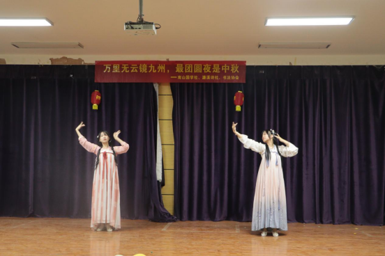 在大学生活动中心,文学社团的成员们身着汉服,伴着古风音乐,翩翩起舞,给同学们带来一场视听盛宴;那铿锵有力的颂咏声,那满怀意境的唯美诗词,声声入心,直沁同学们的心脾。学习社团成员们的大合唱《水调歌头》《月亮代表我的心》《彩云追月》。参与活动的同学卢辉表示:“一首首熟悉的旋律,真的让我有点想家,我也情不自禁地高声附和,跟同学们一起过中秋,真的很温暖也很感动。”