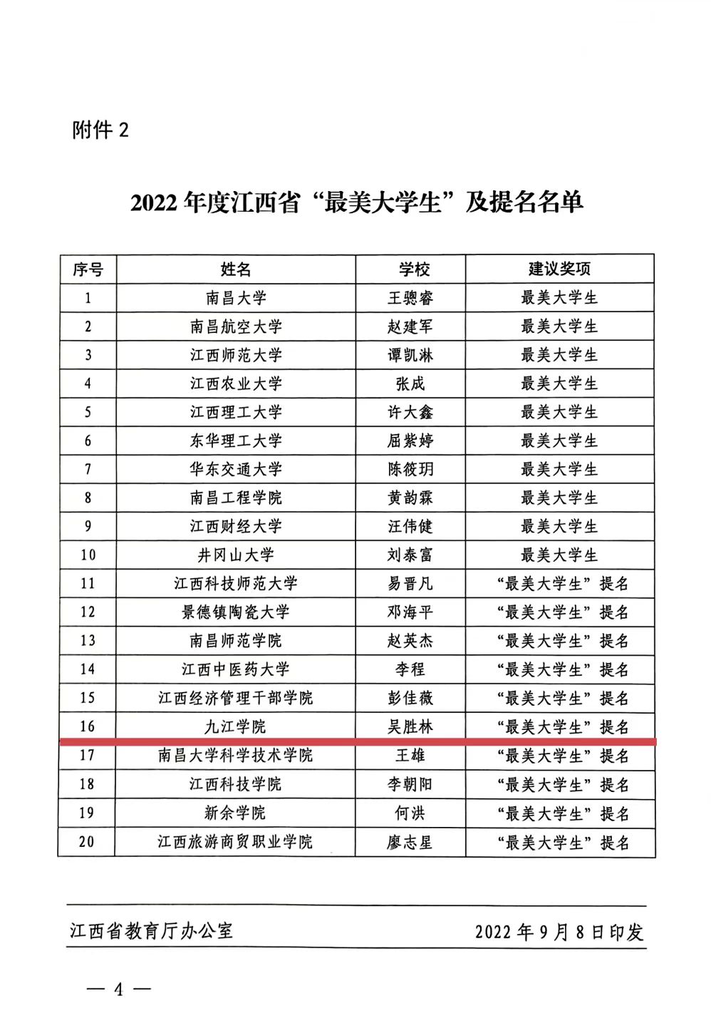 近日,中共江西省委宣传部、中共江西省委教育工委、江西省教育厅联合下发了《关于公布 2022 年度全省高校“最美辅导员”“最美大学生”推选活动结果的通知 》,必赢教育学院吴燕老师荣获2022年度高校“最美辅导员”称号,管理学院18级本科生吴胜林同学荣获2022年度 “最美大学生”提名奖。