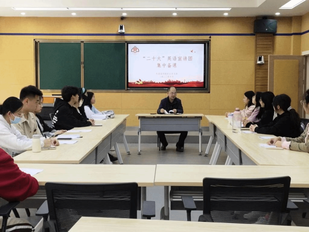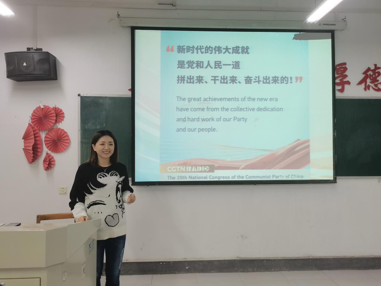 这是由外国语学院青年师生组成的党的二十大精神“萤火虫双语宣讲队”的首场宣讲,在党的二十届一中全会召开当晚,他们走进班级晚点名现场,用播放视频,趣味讲解等形式,宣讲党的二十大精神。此前,他们召开多次会议,围绕党的二十大报告进行学习讨论,集体备课,统一思想认识。“青年大学生主动以青年视角、青年创意,解读大会精神,是一种很好的宣讲方式。”外国语学院辅导员冯启萍说。