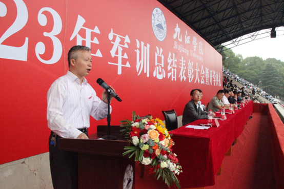 军训旅旅长、武警九江支队机动大队教导员韩凌宣布军训会操结果,军训旅政委、学生处处长吴铃宣布军训内务评比结果。