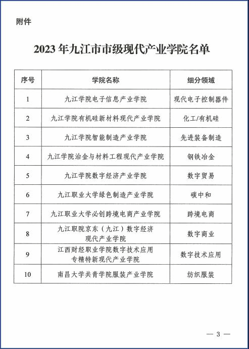 经过两年的实践与探索,学校现代产业学院建设初见成效。有机硅新材料产业学院、电子信息产业学院、智能制造产业学院、冶金与材料工程产业学院、数字经济产业学院5个现代产业学院入围首批九江市市级现代产业学院;有机硅新材料产业学院和电子信息产业学院分别开展“天赐班”“力源班”等产业技术人才班试点工作,为重点产业链龙头和骨干企业培养了一批产业急需人才,“天赐班”首期学生100%入企就业;校企联合出版《材料化学实验》教材及开发《化工设计》课程,共建九江天赐特种功能材料联合实验;有机硅新材料产业学院与企业签约项目20项,经费700多万元,智能制造产业学院选派博士教师到九江市精密测试技术研究所从事博士后研究工作,为研究所争得各类科技经费1300多万元;有机硅新材料产业学院、智能制造产业学院和冶金与材料工程产业学院协同企业进行联合技术攻关,揭榜九江市首届科技重大技术需求“揭榜挂帅”项目7项,经费达740万元,必赢“揭榜挂帅”项目数和经费均位居第一。
