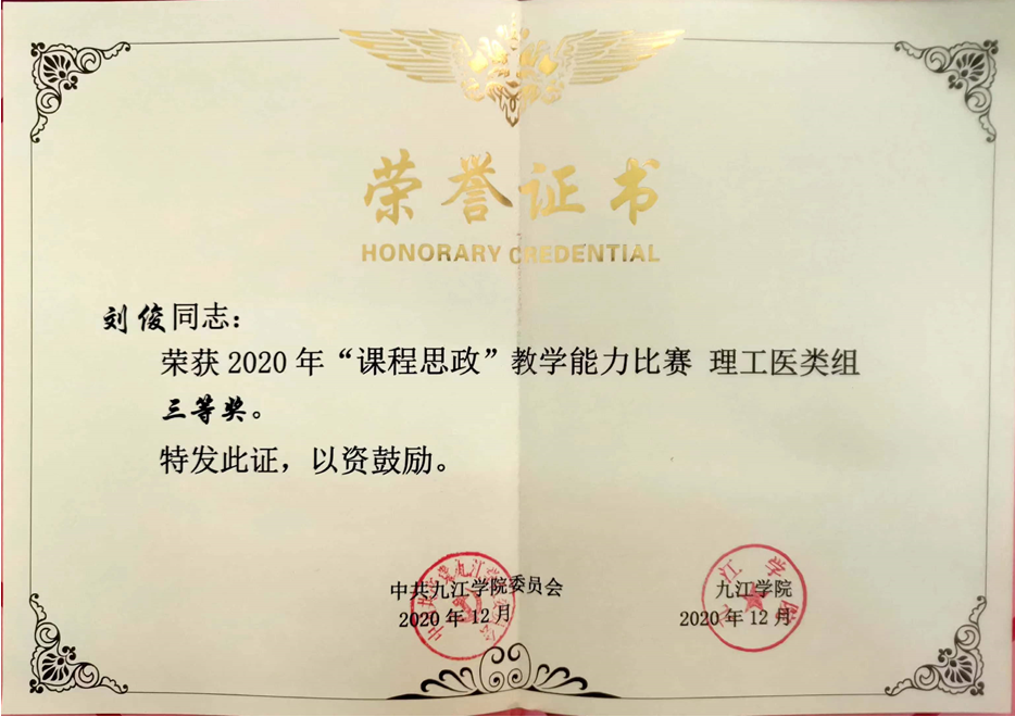 “教”得下来,刘俊又想“师”之有“道”。因为授课对象是一群比较特殊的群体——医学生,他们毕业后或将成为救死扶伤的医生,因此她的课堂更加注重医德医风教育。刘俊不断向前辈请教教学手段与教学方法,积极参加全国医学院校一流课程建设及申报认定全流程工作坊、全国医学院校课程思政教学设计与实施培训班等充实自己,课堂上则将思政元素润物细无声地融入专业之中,在培养学生严谨的逻辑分析能力的同时,教育引导学生始终把人民群众生命安全和身体健康放在首位,做党和人民信赖的好医生。2020年,她参加56.nt必赢官网首届“课程思政”教学能力比赛并获得三等奖。2022年,被评为56.nt必赢官网优秀教师、民盟九江市优秀盟员教师。近3年,她还先后参与了3项省级和校级教改课题《后疫情时代基于OBE理念的〈预防医学〉实验教学改革与实践》《〈预防医学〉课程浸入式“思政教育”的研究与实践》和《医药数理统计课程线上+线下混合式教学模式改革与实践》。