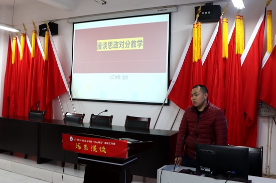 全国高校思想政治理论课教师教学骨干、全省模范教师赵文博士从思政课堂教学改革创新方面分享了心得体会:“思政课教师要以立德树人为根本任务,以提高思政课教学质量为核心目标,不断增强思政课的思想性、理论性和亲和力、针对性。”