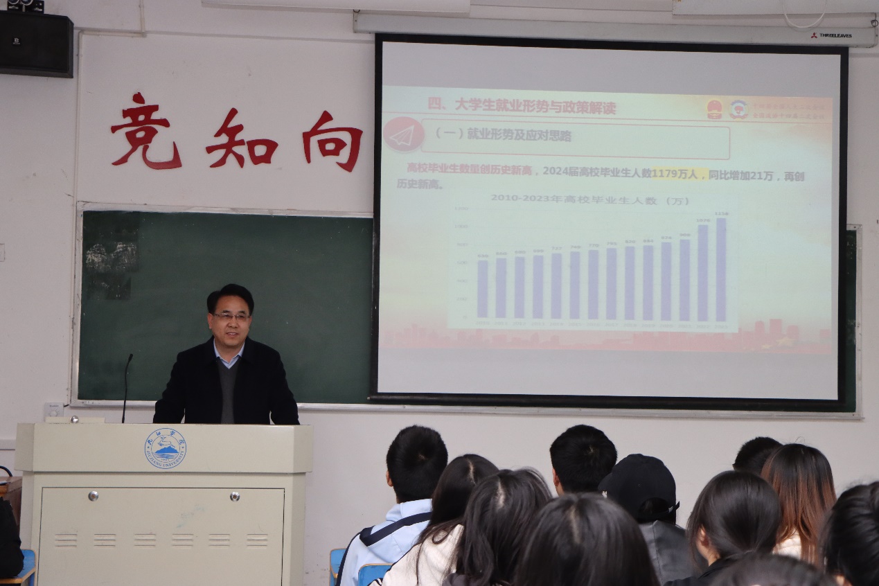 李明斌在课堂上与同学们充分互动,以一名师长的情怀娓娓道来,以丰富的数据深入浅出地解读了近年来高校毕业生就业整体形势,希望广大同学要对就业形势有清醒的认识,要积极适应市场的变化,合理设定就业目标,要提高自身就业能力,要熟悉了解并用好国家、省、市、学校支持毕业生就业创业政策,要用好各类求职招聘平台,要积极投入到学校的各类线下招聘活动中去,要抓住求职过程中的先机,早决定早上岗,在和时代的同向而行中实现个人与时代的共同成就。