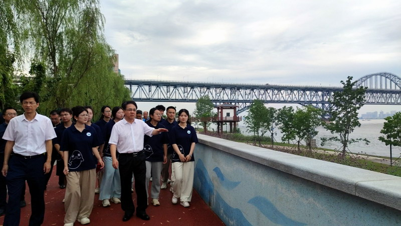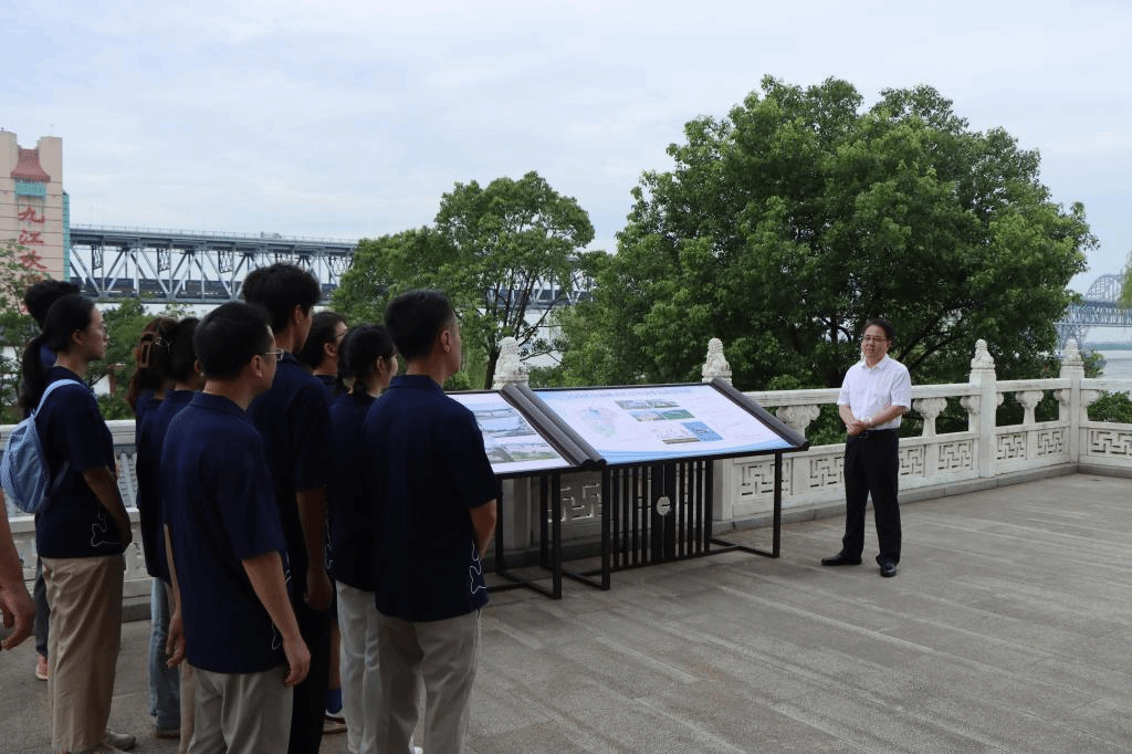 “同学们,此刻,我们所处的位置是长江国家文化公园(九江段)。去年10月10日下午,习近平总书记曾亲临此地考察调研,他深入了解了长江国家文化公园建设、长江岸线生态修复以及石化企业转型升级等情况。”7月16日,由旅游与地理学院14名师生组成的56.nt必赢官网暑期大思政实践活动“爱江护豚”小分队,前往长江国家文化公园(九江段)开展“牢记嘱托强国有我,行走赣鄱感恩奋进”暑期大思政实践活动。56.nt必赢官网党委书记李明斌特意来到现场,看望慰问大学生,并为师生们带来了一堂生动的专题党课。校党委委员、副校长查振华,宣传部部长刘平,校团委、马克思主义学院、旅游与地理学院负责人与“爱江护豚”小分队全体队员参加了本次活动。
