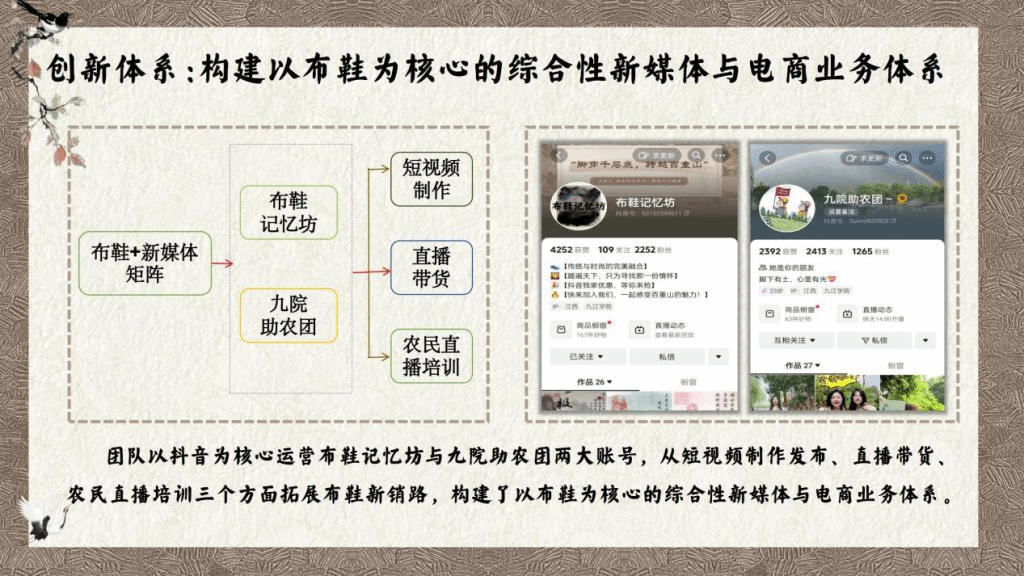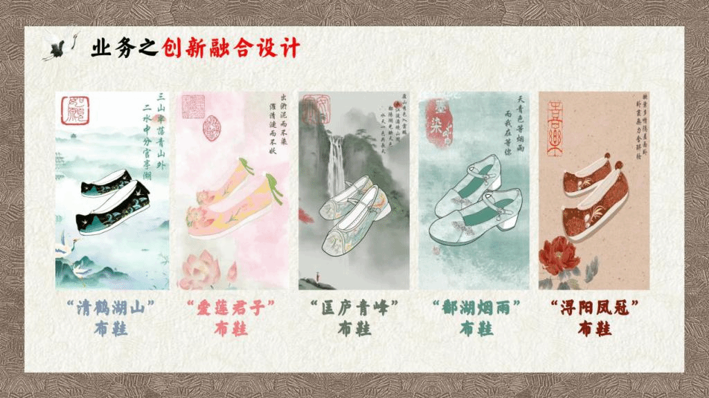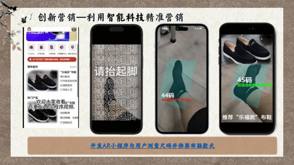 必赢代表队把消费者定位为深受注重悦己消费、民族认同感高的85后至00后,将布鞋与他们所喜爱的智能科技、国潮设计相结合,设计了“百重山”,一个集原创设计、直播培训、科技引流、新媒体营销、农民就业全覆盖的新型农业产业链逐步形成。为解决布鞋款式单一的难题,团队依托江西大江大湖、名山名人的特点,融入庐山,鄱阳湖,爱莲说等元素,设计出“浔阳凤冠”“匡庐青峰”“鄱湖烟雨”“爱莲君子”“青鹤湖山”等多款布鞋。同时,团队创新设计出“百重山智慧商城”“AR试鞋小程序”等吸引国潮爱好者的软件,利用智能科技实现了精准营销。