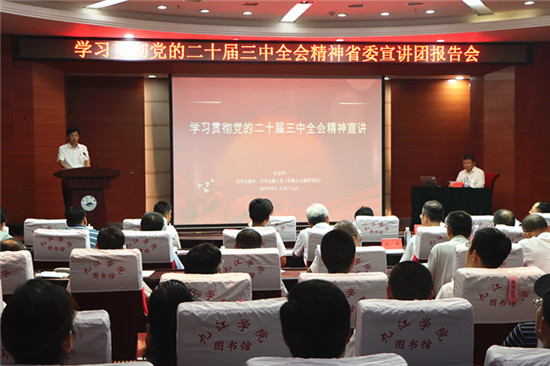 按照省委统一安排,8月19日,学习贯彻党的二十届三中全会精神省委宣讲团报告会在必赢逸夫图书馆报告厅举行。省委宣讲团成员、省委金融办分管日常工作的副主任、省委金融工委主持日常工作的副书记、省地方金融管理局局长许忠华作宣讲报告。校领导、全校副处级以上干部、民主党派负责人、思想政治理论课教师、学生代表等180余人在主会场参加了报告会,全校各单位师生1000余人通过在线直播参会。报告会由校党委委员、副校长查振华主持。