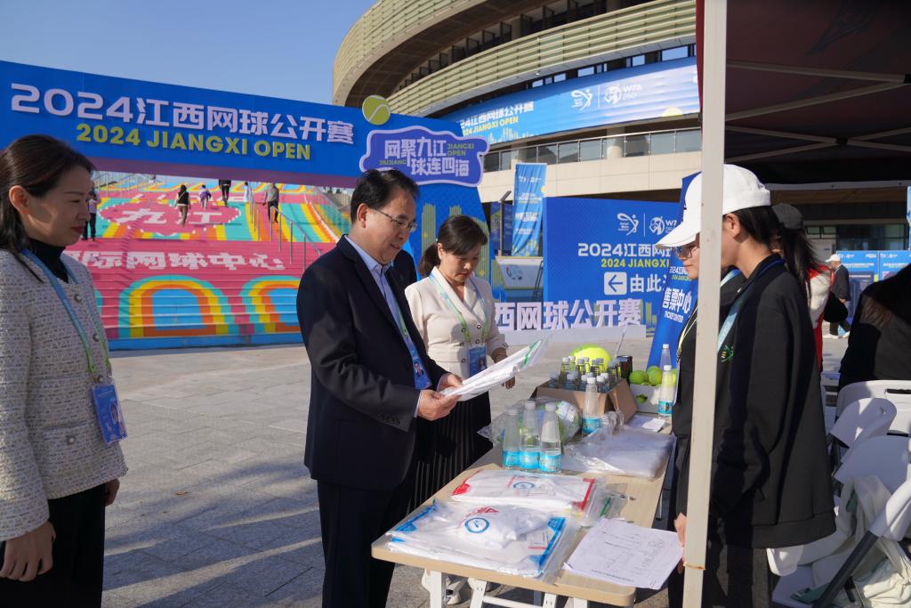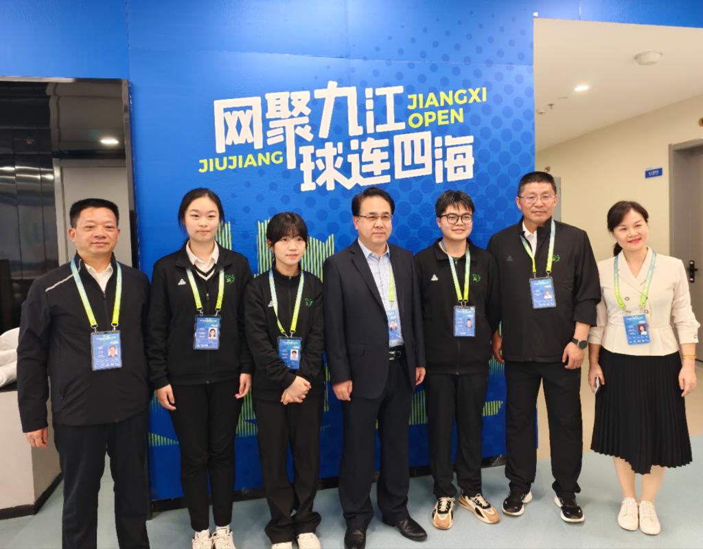 江西网球公开赛联合赛事总监沈红斌,九江市体育局党组书记、局长刘金梅,江西省体发公司相关负责人,以及必赢党政办、团委、体育学院负责人等陪同。