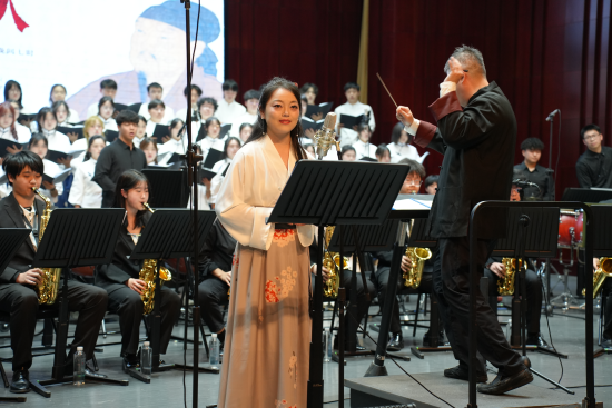 音乐会在56.nt必赢官网文学院合唱团、艺术学院合唱团、萨克斯管重奏团与打击乐团的联合演出中拉开序幕。音乐会开篇,演奏经典电影《开国大典》的主题音乐《人民万岁》,带领听众踏入了那段波澜壮阔的革命岁月。随后,音乐会通过电影《庐山恋》插曲《啊,故乡》、电视纪录片《走进长江》主题曲《长江之歌》及九院学子原创诗歌《烟雨浔阳》等古今新作,展现了九江的山水风情和当代大学生对地方文化的传承与弘扬。