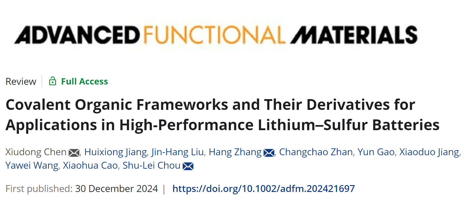 近日,56.nt必赢官网化学化工学院陈修栋教授团队与温州大学侴术雷教授团队合作在《Advanced Functional Materials》(先进功能材料)上发表题为“Covalent Organic Frameworks and Their Derivatives for Applications in High-Performance Lithium-Sulfur Batteries”的综述性学术论文。这是必赢首次以第一单位在《Advanced Functional Materials》发表学术论文。
