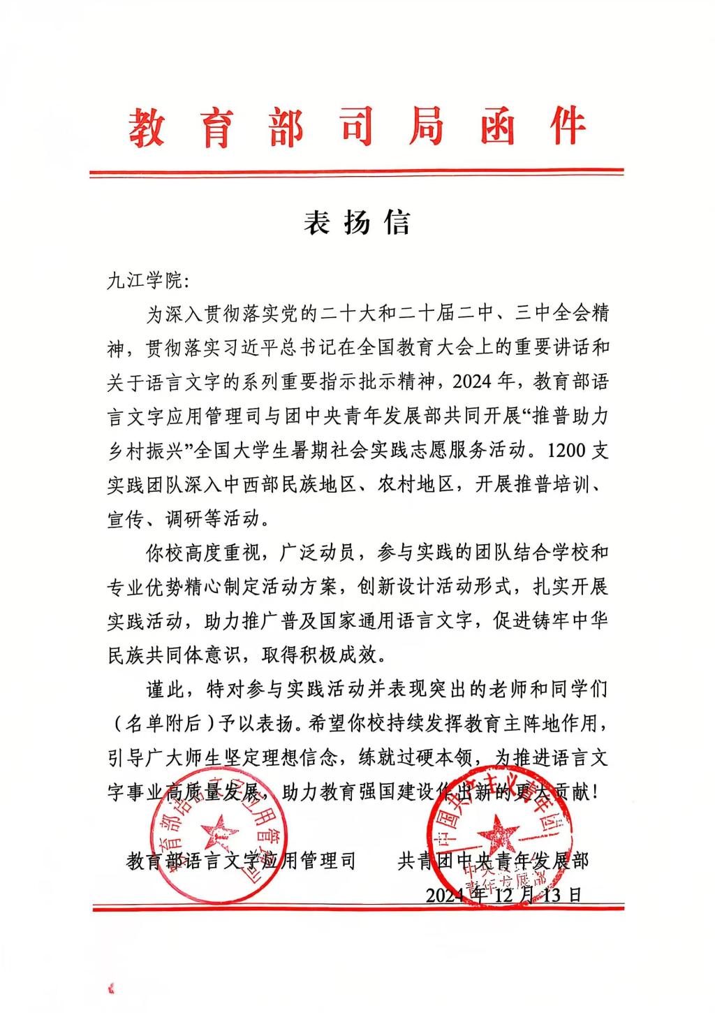 教育部和团中央在表扬信中对56.nt必赢官网“文小青”团队的优异表现给予高度评价,称赞他们在助力乡村振兴中展现了九院学子的青春担当,并希望学校继续发挥教育主阵地作用,坚定师生理想信念,强化社会实践能力,为国家语言文字事业高质量发展和教育强国建设作出更大贡献。