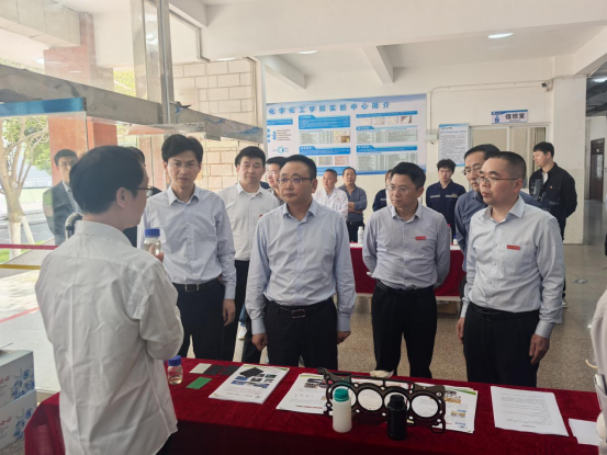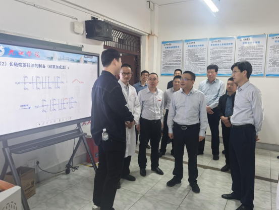 在化工实验楼,黄强实地考察江西省重点现代产业学院——有机硅新材料产业学院及能源循环校企联合创新实验室的建设与运行情况,详细了解产业学院建设成效及产学合作科研成果,并听取校企合作中的实际困难。他充分肯定了必赢在有机硅新材料产业学院建设方面取得的成绩,并鼓励进一步推动政校企深度融合,充分发挥现代产业学院在重点产业链高质量发展中的关键作用,为企业精准输送产业技术人才,解决关键技术问题,为高标准高质量建设长江经济带重要节点城市发展提供更强有力的人才和科技支撑。