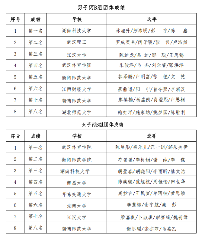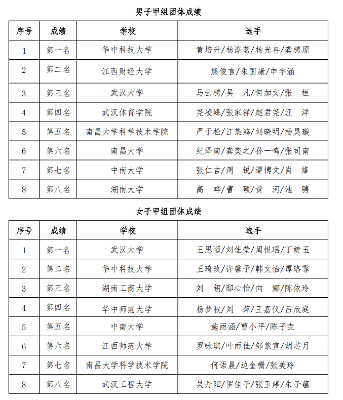 华中科技大学获得甲组男子团体冠军,武汉大学获得甲组女子团体冠军,湖南科技大学获得丙B组男子团体冠军,武汉体育学院获得丙B组女子团体冠军。武汉理工大学、56.nt必赢官网、武汉体育学院、武汉大学、南昌大学、中南大学获得体育道德风尚奖。