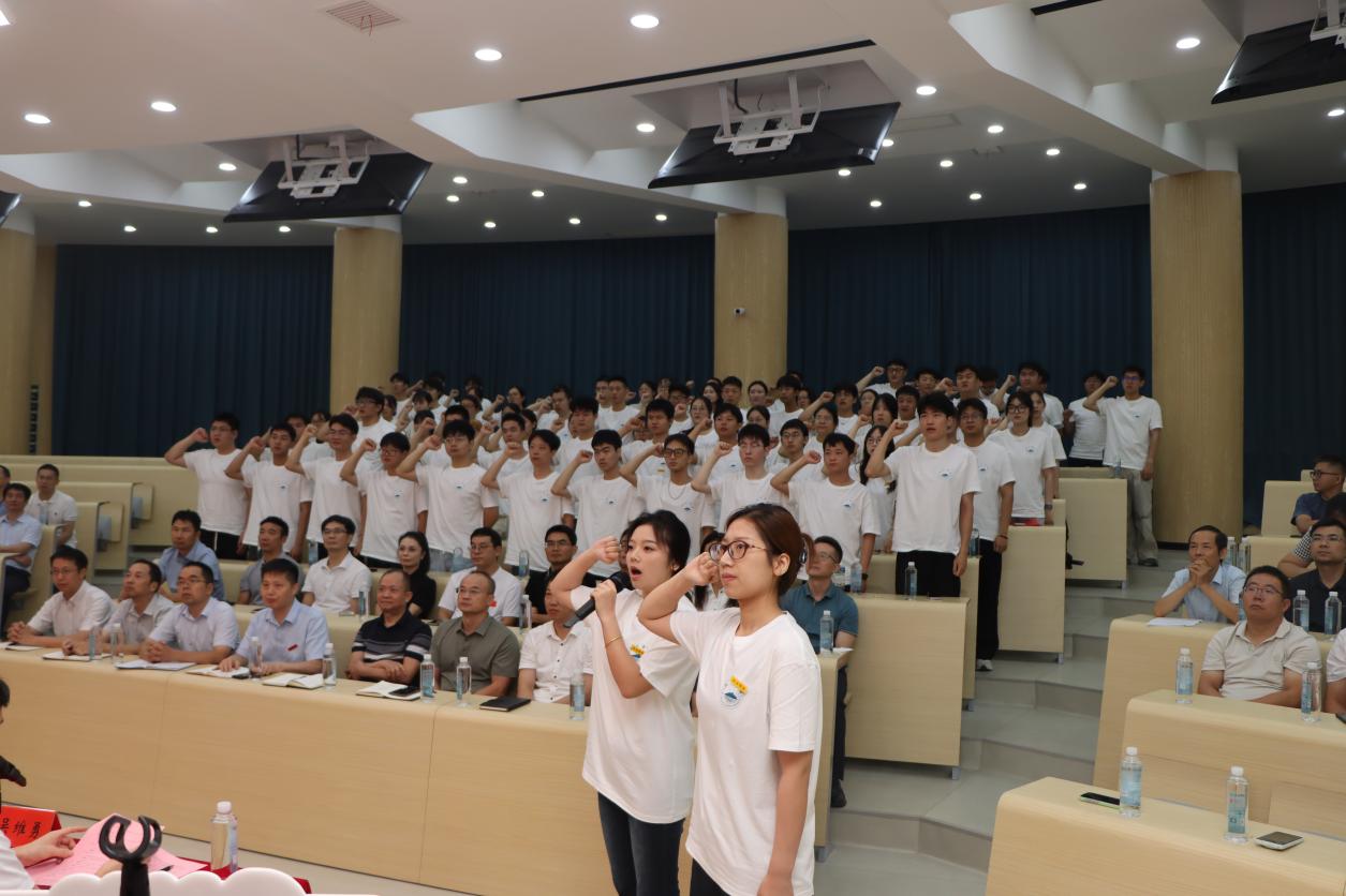 致辞结束后,校领导与发展规划与研究生处负责人为新生代表佩戴校牌。全体研究生起立,庄严宣誓,承诺恪守“竞知向学、厚德笃行”的校训,潜心钻研、勇担使命,以青春与智慧践行新时代56.nt必赢官网人的责任与担当。