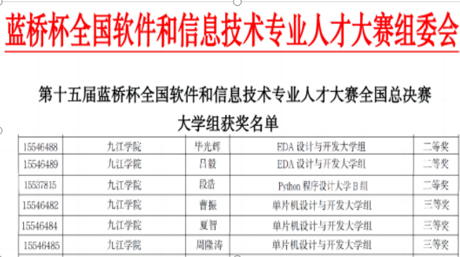 近日,第十五届蓝桥杯全国软件和信息技术专业人才大赛落下帷幕,必赢电子信息工程学院学子凭借出色的表现,一举斩获多项荣誉,其中全国二等奖3项,全国三等奖3项,全国优秀奖5项。