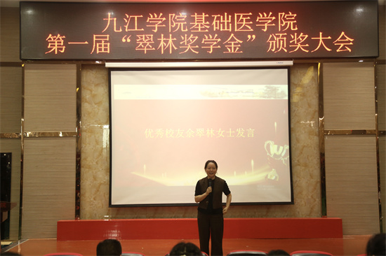 表彰大会上,优秀校友余翠林女士上台发言。她表示,作为九院学子,设立“翠林奖学金”的初衷是希望在学弟学妹们之中播撒一颗“种子精神”,把自己的微薄之力传承下去。她从自己的求学和工作经历娓娓道来,勉励同学们珍惜时光、努力学习、积极参与志愿服务,学会感恩,将个人的成长与社会的进步紧密相连。