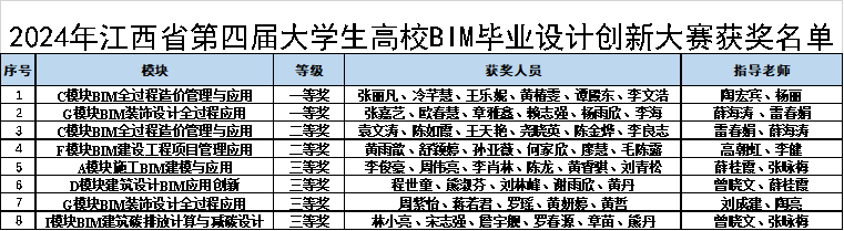 第四届江西省大学生高校BIM毕业设计创新比赛分为初赛、复赛两个环节,历时5个月,吸引了省内40所高校超过300支队伍报名参赛。此项赛事被列为教育部A级权威比赛的目录,比赛内容覆盖工程类专业整个学科体系,为工程类专业师生提供了一个多学科、多专业交叉融合、创新应用的良好舞台,是检验专业课教学的试金石。建工师生认真备赛,最终8支队伍闯进决赛获奖。