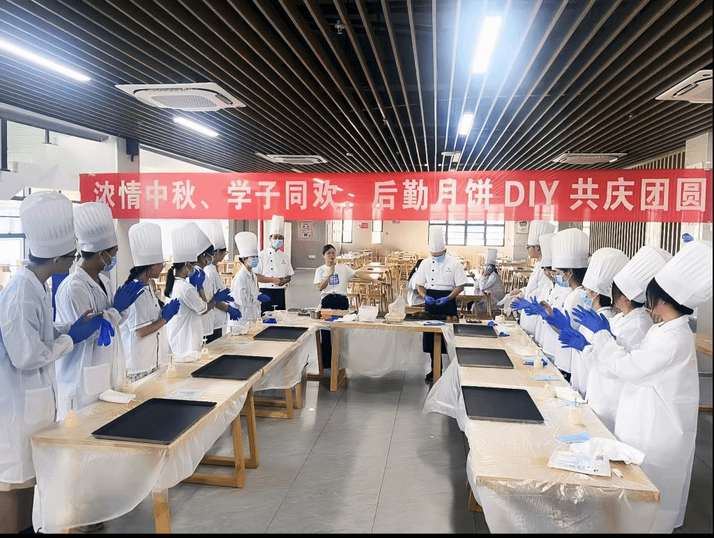 此外,活动还特别设置了学生DIY制作月饼的环节。在紫薇园学生二食堂大厅内,20余名学生在专业糕点师的指导下,亲手制作属于自己的月饼。他们一边制作,一边交流着中秋的故事和传统文化,现场气氛热烈而温馨。通过DIY制作月饼,学生们不仅体验到了传统工艺的魅力,还增进了彼此之间的友谊,丰富了校园文化生活。