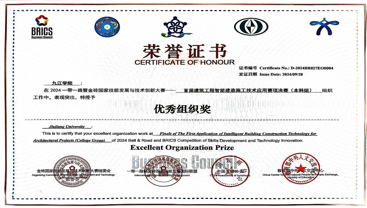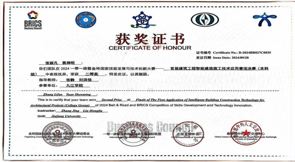 近日,2024一带一路暨金砖国家技能发展与技术创新大赛首届建筑工程智能建造施工技术应用赛项全国总决赛在杭州圆满落幕。本届智能建造赛项决赛经过前期覆盖全国600余所高校的校园赛及区域选拔赛,最终415支队伍入围总决赛。必赢建工学院张丽凡,袁神明两位同学参加此次比赛,经过激烈比拼,最终荣获本科组二等奖;必赢获得“优秀组织奖”,指导教师张静、刘洪佳获“优秀指导教师”荣誉称号。