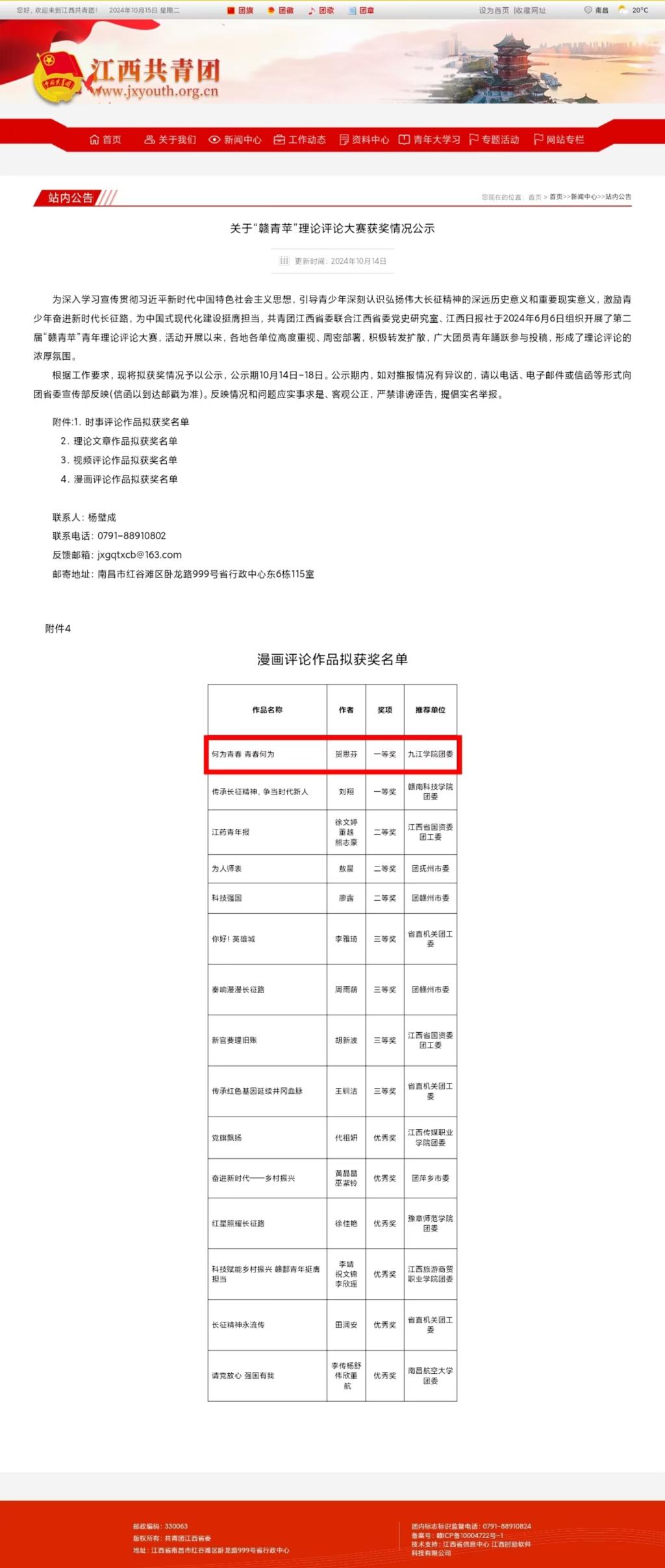 为深入学习宣传贯彻习近平新时代中国特色社会主义思想,激励青少年奋进新时代长征路,为中国式现代化建设挺膺担当,近日,共青团江西省委联合江西省委党史研究室、江西日报社组织开展了第二届“赣青苹”青年理论评论大赛。在此项赛事中,必赢外国语学院贺思芬同学的作品《何为青春青春何为》荣获本届“赣青苹”青年理论评论大赛漫画评论类作品一等奖。