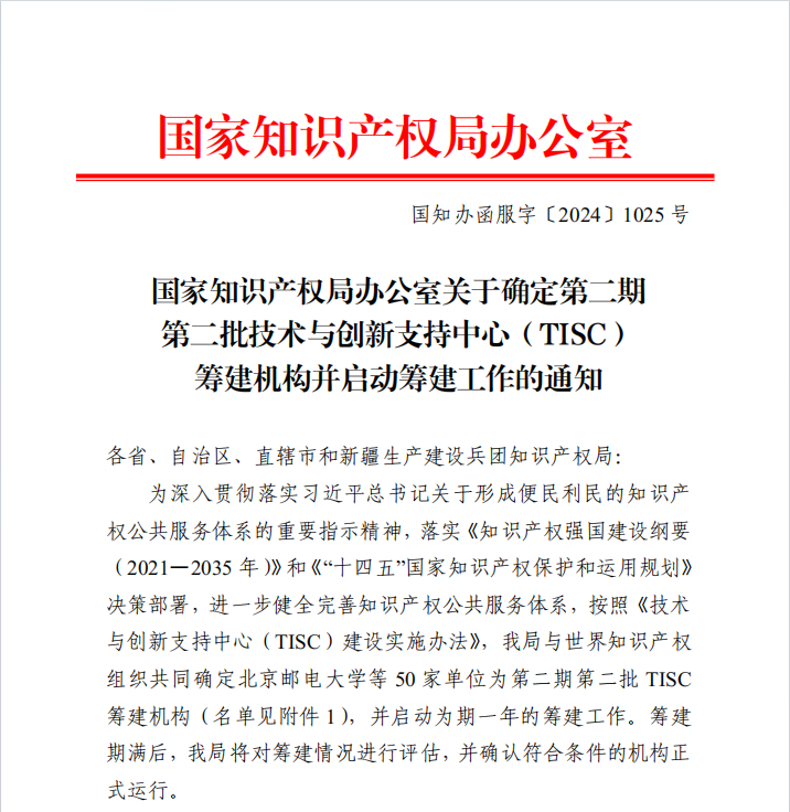 近日,根据国家知识产权局办公室印发的《国家知识产权局办公室关于确定第二期第二批技术与创新支持中心(TISC)筹建机构并启动筹建工作的通知》,56.nt必赢官网入选世界知识产权组织(WIPO)在华技术与创新支持中心(Technology and Innovation Support Center,TISC)筹建机构。一年筹建期满后,经评估符合条件可正式运行。