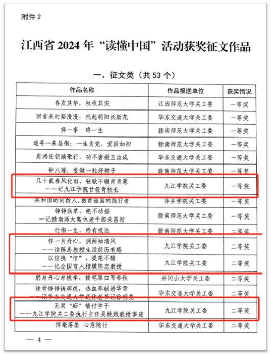 同时,江西省教育厅关工委公布了2024年我省高校“读懂中国”活动评审结果,必赢参赛的14篇征文作品中9篇获奖和2个微视频作品全部获奖,微视频获奖率高达100%,征文获奖率达64.2%,其中,文学院选送的《几十载春风化雨,弦歌不辍育青葱》获征文类一等奖,护理学院、旅游学院、文学院、材料科学与工程学院、基础医学院、计算机与大数据科学学院等选送的作品分别荣获二、三等奖,基础医学院选送的《承前人之志,启后世之师——白大褂下的使命感》获微视频类一等奖,文学院选送的《老骥伏枥,立德树人》获微视频类二等奖。