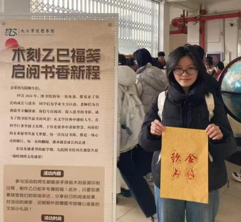 “我拓印的是‘金榜题名’。去年,我通过高考来到九院,这个词最能反映我当时的心情。”来自计算机与大数据科学学院的杨昊錡同学拿着刚刚完成的木刻版画说道。2月26日下午,在图书馆丹枫馆一楼大厅举办的“木刻乙巳福笺,启阅书香新程”木刻版画体验活动吸引了众多师生们前来。通过亲手制作乙巳蛇年主题版画、分享阅读故事,九院学子共同开启了一段传统艺术与经典阅读交融的文化之旅。