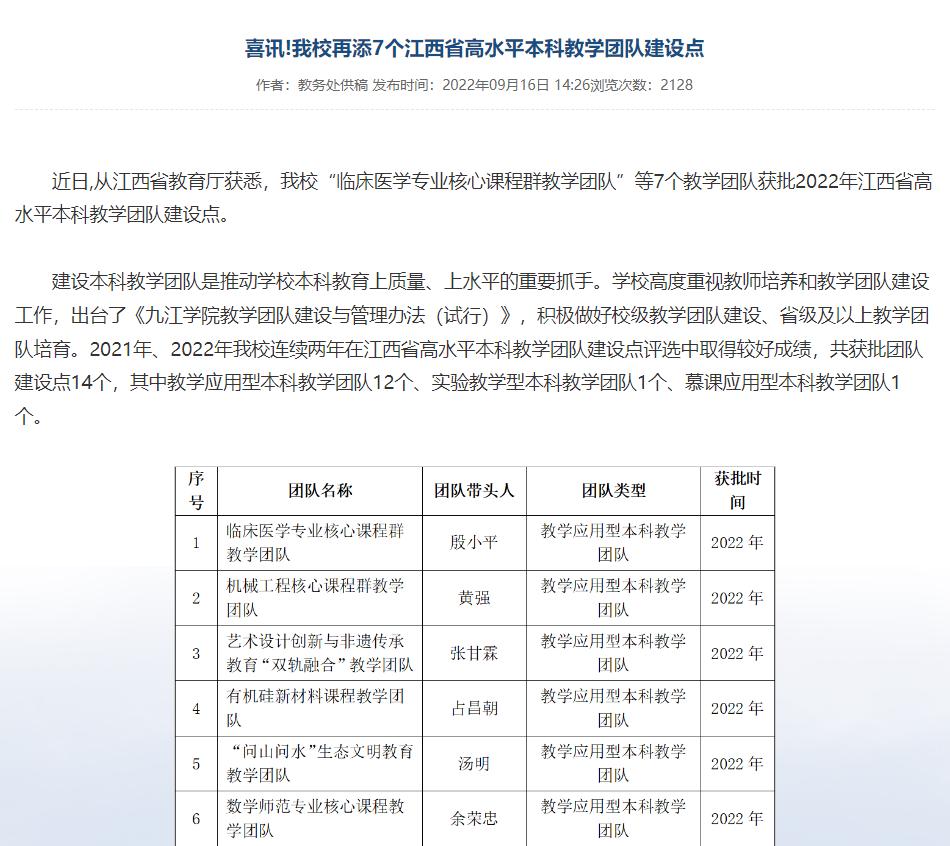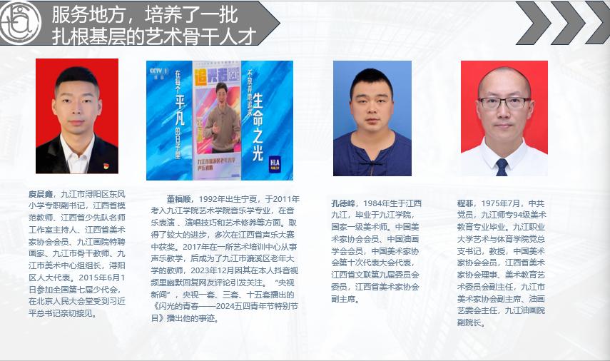 九江青年歌舞团原创舞蹈作品《瑶光赋》入选第十三届中国舞蹈“荷花奖”古典舞终评,并获批国家艺术基金项目,也是自首届“荷花奖”评奖以来江西省第一个古典舞作品入选作品,是江西省在古典舞创作水平上的新突破,原创舞剧《大湖之灵》入选中国文联2024年重点扶持项目;团队荣获“2024年56.nt必赢官网教学成果奖特等奖”“中国舞蹈家协会新农村舞蹈美育优秀志愿者团队”称号。
