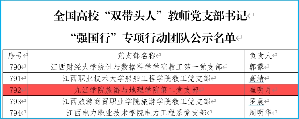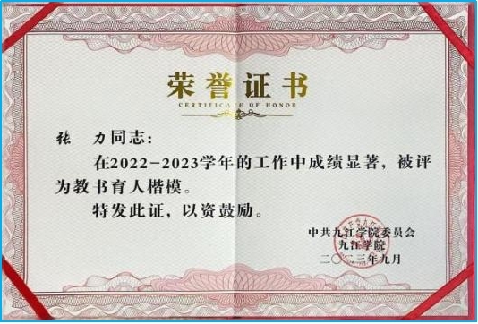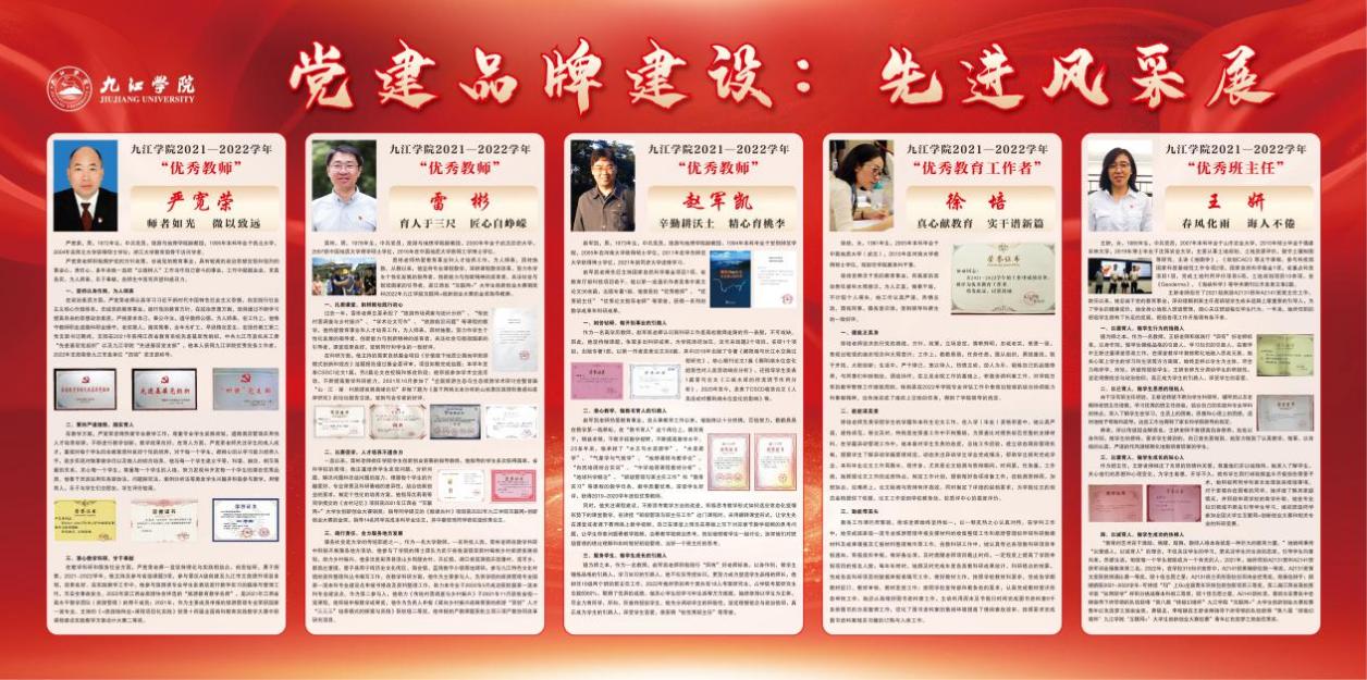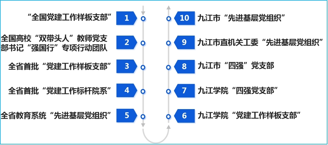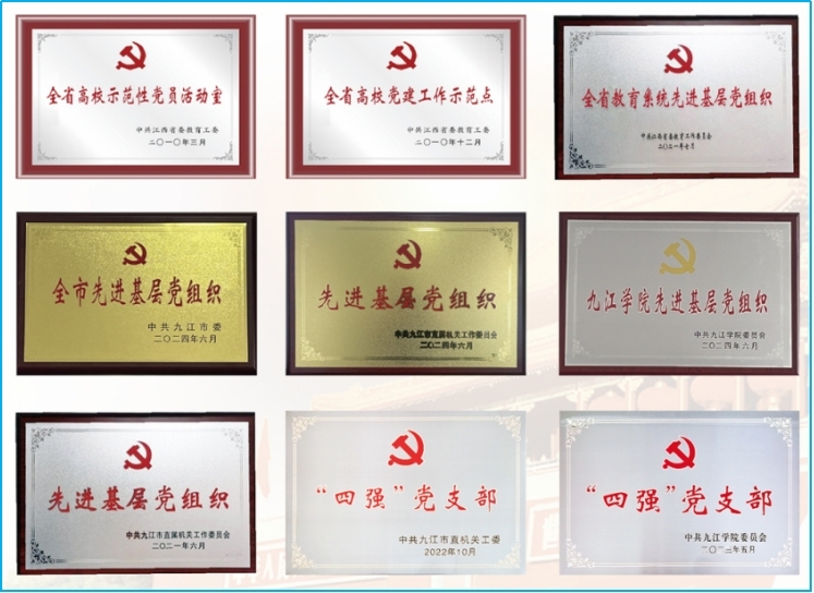 教工第二党支部2021年荣获全省教育系统“先进基层党组织”和九江市直机关工委“先进基层党组织”称号;2022年荣获九江市直单位“四强”党支部称号、56.nt必赢官网“四强”党支部称号;2023年获批江西省首批“全省党建工作样板支部”;2024年获批第四批“全国党建工作样板支部”培育创建单位、全国高校“双带头人”教师党支部书记“强国行”专项行动团队、56.nt必赢官网“先进基层党组织”称号。