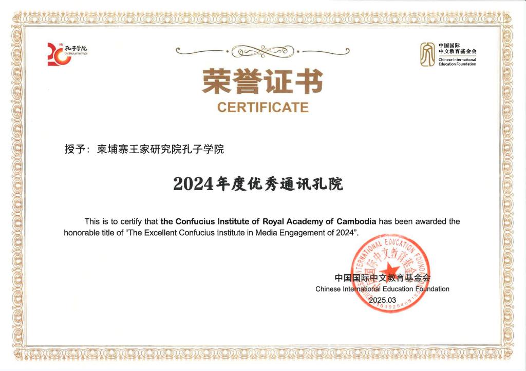 2024年,适逢孔子学院品牌创立20周年,全球孔子学院(课堂)积极开展各类活动,致力于提升孔子学院的品牌影响力。根据全球近500家孔子学院(课堂)的投稿数量、录用情况、文稿和视频的原创性等多项指标,中国国际中文教育基金会授予61所孔子学院“2024年度优秀通讯孔院”称号。必赢合作设立的柬埔寨王家研究院孔子学院成为柬埔寨唯一获此称号的机构。