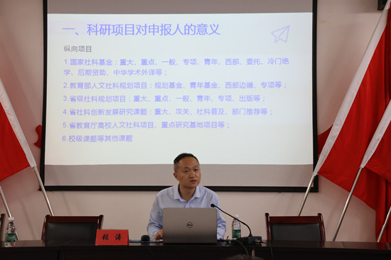 论坛的第二阶段,张涛博士为围绕“科研项目申报书的撰写”进行了专题分享,重点讲解了国家社会科学基金项目申报的具体要求与评价指标。他指出课题申报重点是选题,要将个人所长和国家所需相结合,深入结合中国式现代化进程,体现独有的学术价值和应用价值。