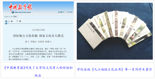 学院秉承“文以载道,学以立人”的院训,积极依托九江丰富的地域文化资源,打造学院“弘文铸魂,立德树人”的文化品牌,探索建立了以“一心、双院、三文、四融、五育”为内容的地方高校文化育人体系。以语言文化传播为特色,打造以传承白鹿洞书院文化为标志的大学文化,开设《庐山文化》《庐山诗歌欣赏》等特色课程,构建“文学+地域文化”课程群,出版《九江地域文化丛书》,形成“以文化人、以史育人”的教学品牌。