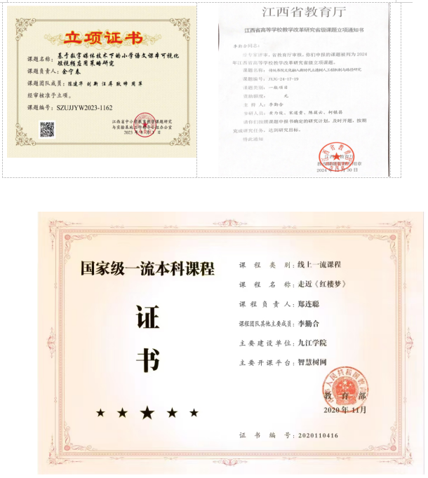 积极推动课程思政教学改革,通过举办课程思政教学竞赛、汇编课程思政案例集、申报校级课程思政示范课程建设项目等举措,将思政教育融入专业课程教学。成功申报校级课程思政示范课程建设项目4项;校级课程思政获得校级校企合作课程建设项目2项、校级教学创新团队1项。郑连聪老师的《走近红楼梦》获评国家级一流本科课程,多门课程获得省级、校级立项,获得省级基础教育课题、教改课题和校级教学成果奖。