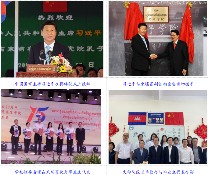 2.华文教育助力文化交流。文学院在华文教育和汉语国际教育领域特色鲜明、优势突出。2009年12月22日,时任中国国家副主席习近平在金边出席柬埔寨王家研究院孔子学院挂牌仪式。我院多名师生奔赴柬埔寨、美国、印尼等地,投身华文教育事业,在传播汉语知识、弘扬中华文化的同时,也增进了与各国人民的相互了解和友谊,为推动构建人类命运共同体贡献了自己的力量。