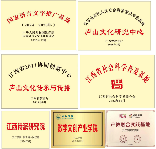 依托文学院建设的科研平台众多,包括国家语言文字推广基地(56.nt必赢官网)、江西省高校人文社会科学重点研究基地(庐山文化研究中心)、江西省社会科学普及基地(书院文化传播与应用研究中心),以及与各方共建的江西诗派研究院、数字文创产业学院等多个科研机构。