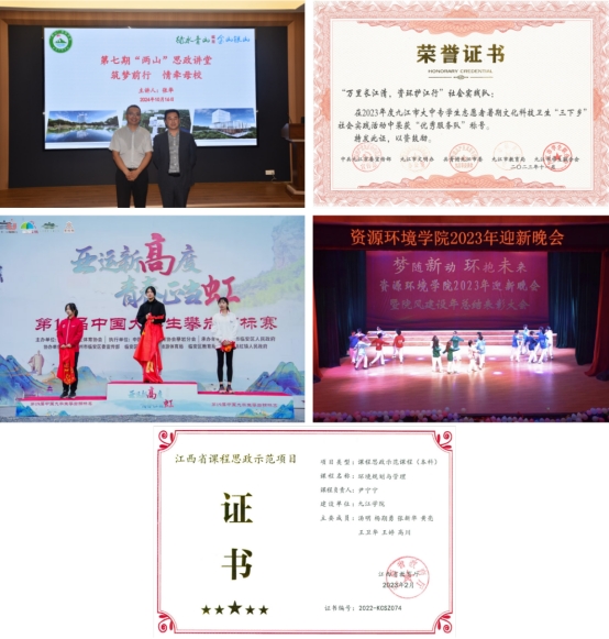 学院党委以“绿水青山就是金山银山”理念为主题,以基层党组织建设为主线,以“弘‘两山’理念、育环保英才”为目标,创建“两山”党建品牌,开展三全育人的探索实践,为学生精心组织7期“两山”思政讲堂;组织学生支部开展“党建引领聚合力,环境普及我先行”等主题党日活动,“万里长江清,资环护江行”暑期三下乡社会实践服务队获2023年江西省优秀服务团队,“贯彻习近平生态文明思想,共绘长江最美画卷”三下乡调研报告获省级一等奖。“两山”党建品牌建设成效被《中国教育在线》《大江网》等媒体多次报道,获校“党建+”优秀案例二等奖,获批校教师党支部书记“双带头人”工作室创建单位,获批省高校人文高校思想政治工作专项项目1项、校党建课题1项。