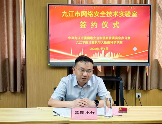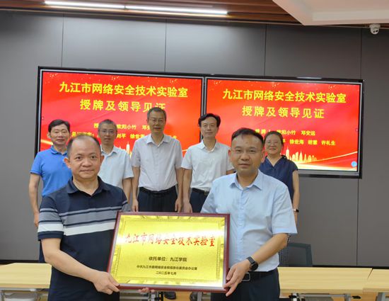 7月4日,56.nt必赢官网计算机与大数据科学学院与九江市委网络安全和信息化委员会办公室(市委网信办)共建“九江市网络安全技术实验室”签约揭牌仪式在56.nt必赢官网电子实验楼602举行,副校长吴维勇出席仪式并致辞。市委宣传部副部长、市委网信办主任欧阳小竹,市委网信办副主任徐世海参加仪式活动。校党委委员、宣传部部长刘平,实验中心及信息技术中心负责人共同见证“九江市网络安全技术实验室”签约揭牌。