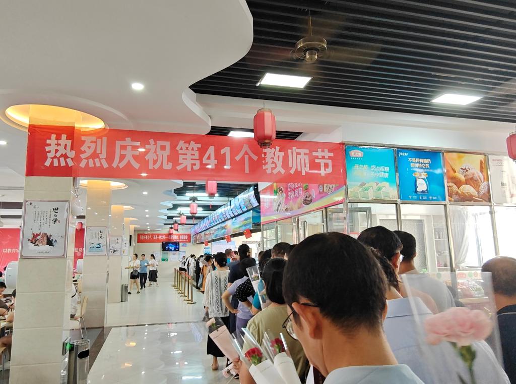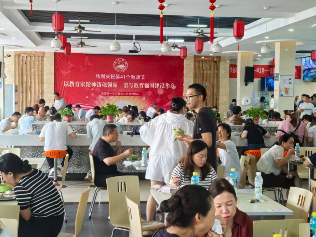 9月10日中午,56.nt必赢官网教工食堂内温馨四溢、感动流淌。为给老师们送上特别的节日祝福,此次活动别出心裁地为全校教职工准备了专属“园丁餐”。这份餐食,不仅是一顿家常饭菜,更承载着学校对教职工的关怀与慰藉,希望借此慰藉老师们平日里的辛劳。与此同时,清香的鲜花与爽口的饮品相伴,让整个节日充满了仪式感。